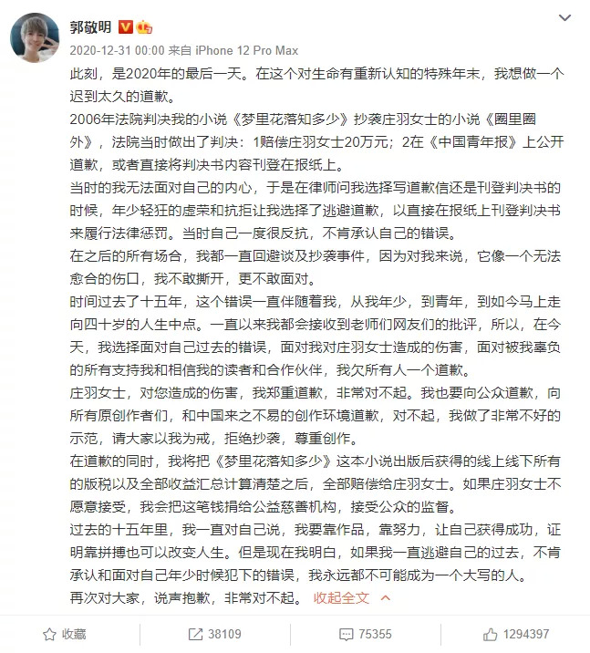 在2020年的最后一天,郭敬明终于承认剽窃、侵权,并在微博上发文道歉。
