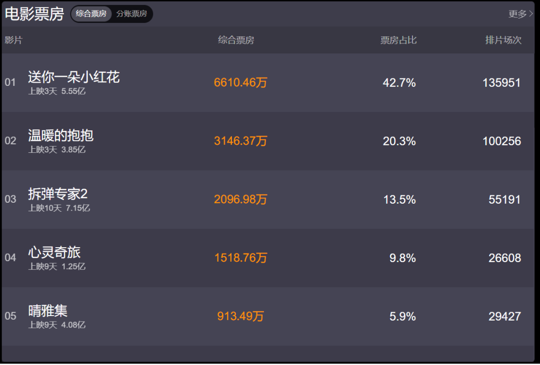 从票房数据来看,《晴雅集》上映5天,票房突破3亿,截至1月2日12:32,上映9天《晴雅集》票房已经到了4.1亿。这超过郭敬明以往所有电影的票房。不过,与同期电影相比,这个成绩不算亮眼,同期上映的《拆弹专家2》票房已经达到了7.1亿,上映仅3天的《送你一朵小红花》也达到了5.5亿。