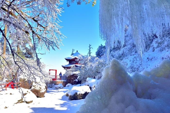瓦屋山被《中国国家地理杂志》授牌“最美桌山”,是冬日观冰瀑的最佳之地,72条冰瀑悬空,其中最为壮观的是落差高达1040米的兰溪瀑布。冬季的瓦屋山上有冰挂、雪挂、雪松、冰柱等自然景观,华丽的冰雪风光美不胜收。故素有“瓦屋冰雪,南国一绝”之美誉。这里还是雪地运动爱好者的乐园,滑雪、雪地摩托、雪地越野、雪地冲锋舟、儿童乐园......种类多样又好耍。