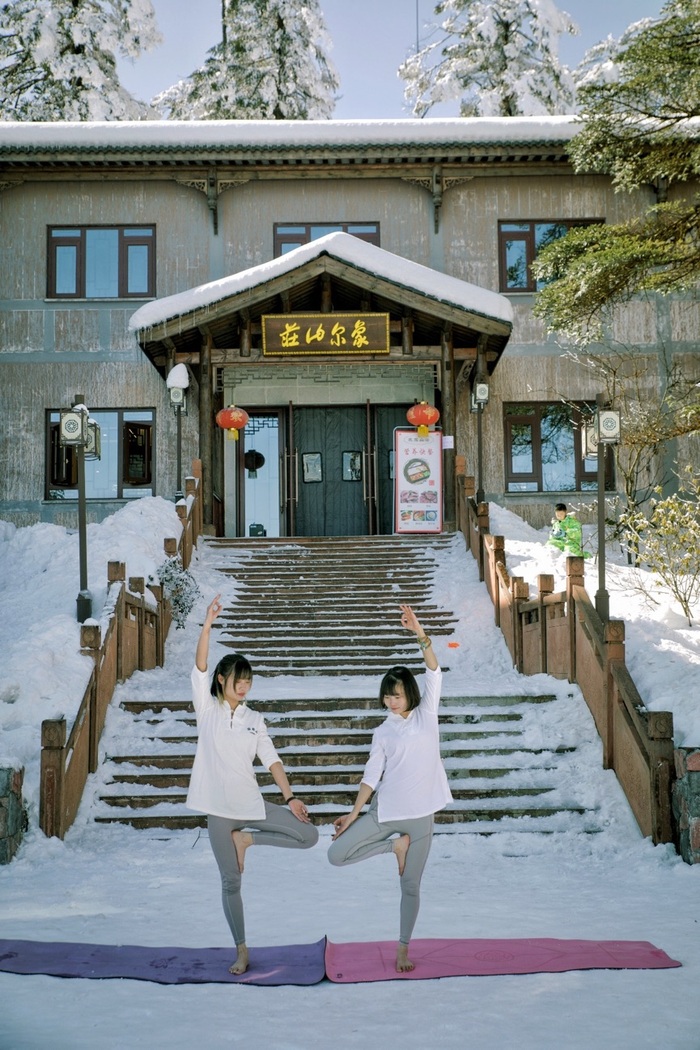 2021年1月1日-2日,瓦屋山还举办了古筝、瑜伽、茶艺表演,一首首优雅的古筝歌曲吸引了众多游客驻足聆听,在冰天雪地的世界中感受无限浪漫。同时,在冰湖美景的鸳鸯池上演了一场花式瑜伽表演,让游客朋友们在银装素裹的美景中,感受到了柔韧运动的魅力。