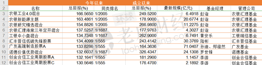choice数据显示,截至12月31日,2020年以来权益型基金排名TOP4皆为农银汇理基金旗下基金,分别为农银工业4.0混合、农银新能源主题、农银研究精选混合、农银汇理海棠三年定开混合,基金经理都是赵诣。其中,农银工业4.0混合是混合型基金冠军,收益率为166.57%;陆彬管理的汇丰晋信低碳成为股票型基金冠军,收益率为134.41%。