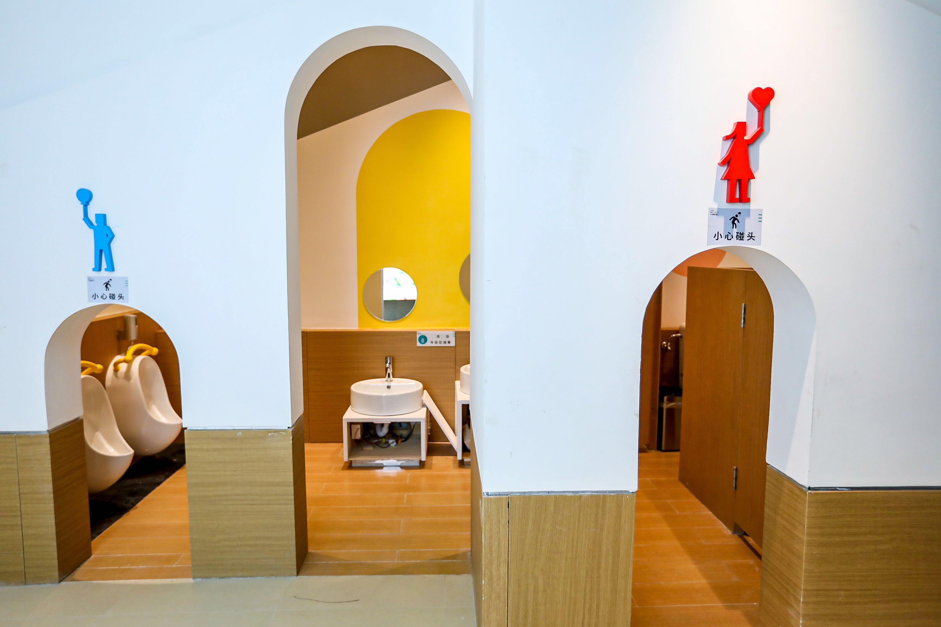 “儿童大多活泼好动,所以三楼我们替代商户进行了统一的环保装修,使用环保地胶、地毯,这样小孩子玩起来也无压力。“吴瞳介绍,还同时在三楼专门建造了家庭卫生间:“市面上大部分的母婴室主要解决幼童如厕。但是有了一定性别意识的小童在上厕所时,通常会遭遇一些麻烦。家庭卫生间就解决了这类安全隐患,也让父亲更多参与带小孩,对小朋友的性别意识也更友好。”