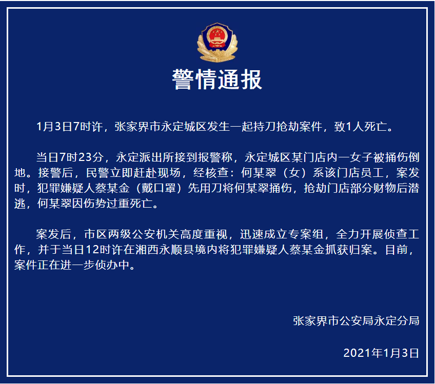 据湖南省张家界市公安局永定分局微信公众号消息,1月3日7时许,张家界市永定城区发生一起持刀抢劫案件,致1人死亡。