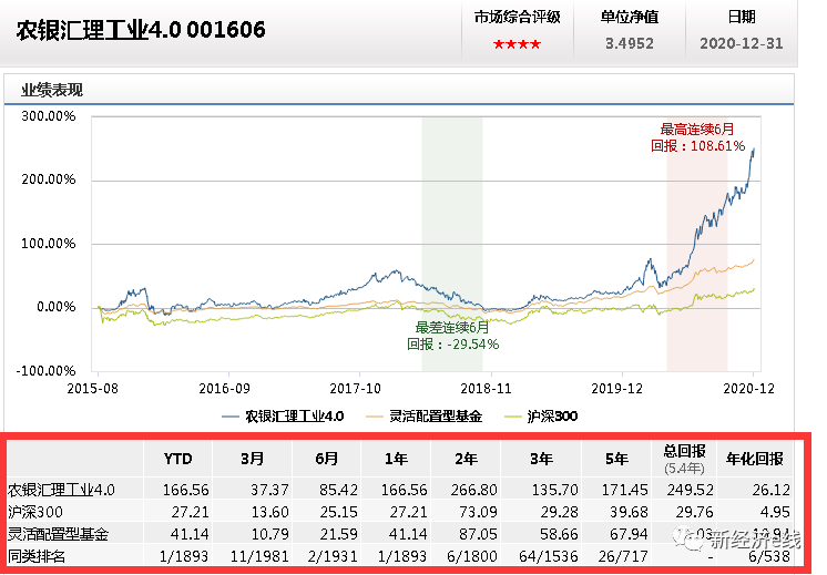 不过,新经济e线调查发现,已经揭晓的主动权益类基金年度成绩单表明,基金业绩分化在2020年也演绎到了极致。以灵活配置型基金为例,在同类可比的1893只基金中,首尾相差更是高达178.22%。由基金经理赵诣管理的农银汇理工业4.0高居榜首,该基金以166.56%的回报率遥遥领先。