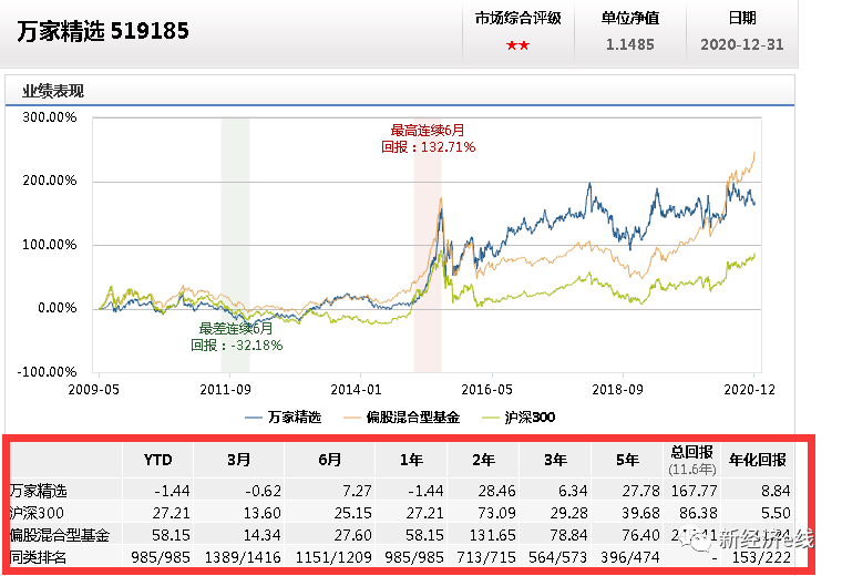 同样,在可比的985只偏股混合型基金中,万家精选也成为了唯一一只亏损而垫底的基金。截至2020年12月31日,万家精选总回报为-1.44%。