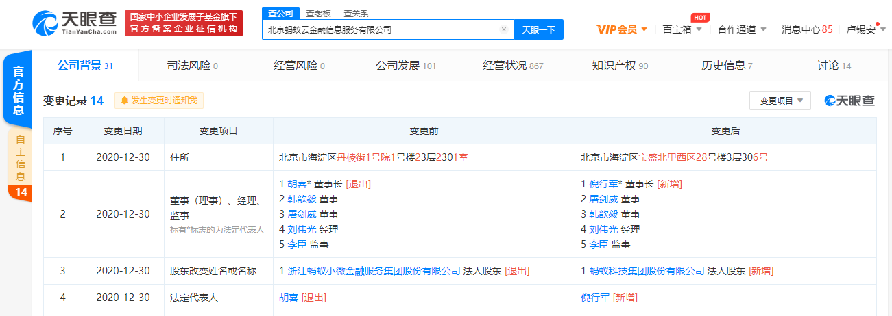 据天眼查APP显示,12月30日,北京蚂蚁云金融信息服务有限公司发生工商变更,胡喜退出公司法定代表人、董事长,新增蚂蚁金服CTO倪行军为法定代表人、董事长。