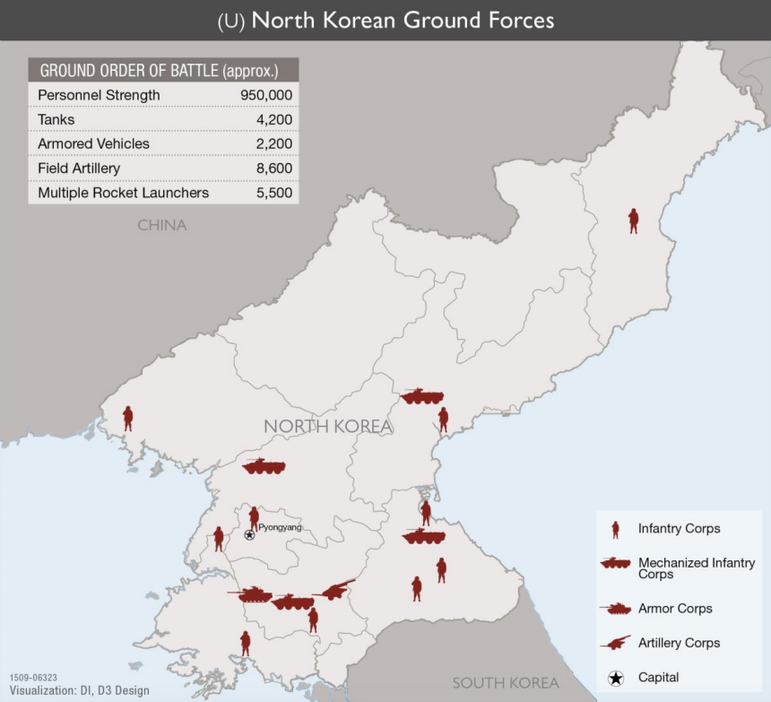 地面部队是朝鲜军事力量的主力,其中接近70%的部队部署在距朝韩边境线100公里以内的前沿区域。