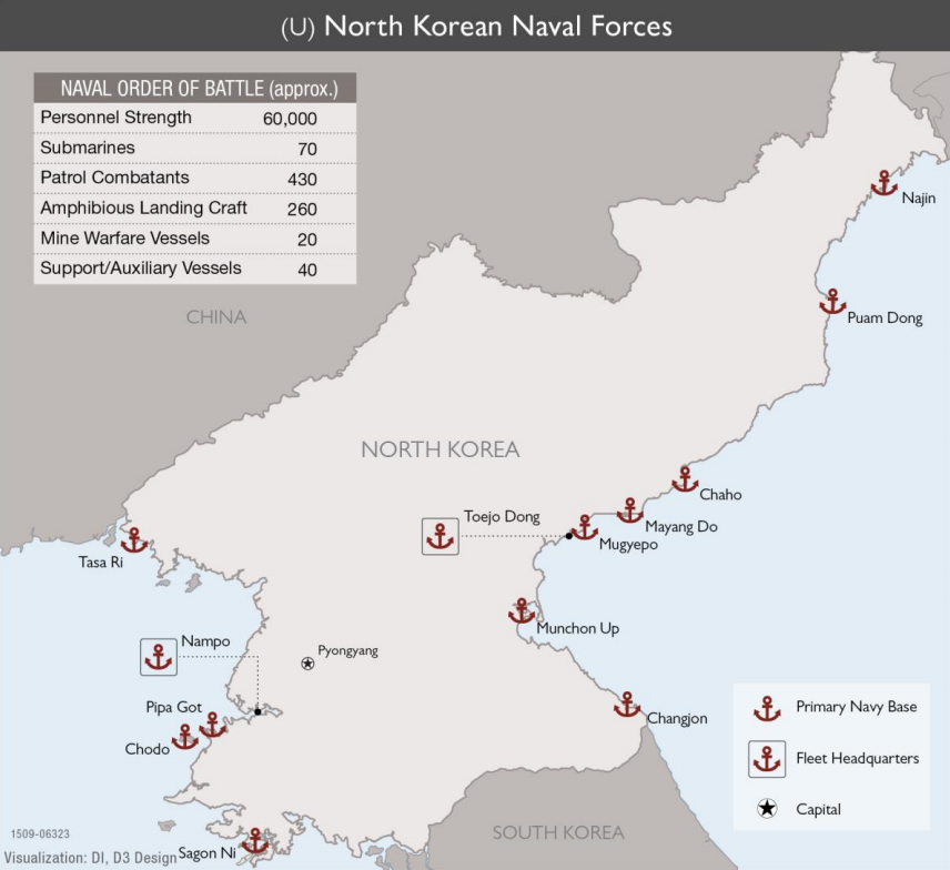 海军是朝鲜军队中最小的一个分支。与地面部队和空军一样,朝鲜50%的海军部队部署在朝韩边境线100公里以内。海军主要由老旧的巡逻艇、潜艇、气垫船和两栖舰艇组成。