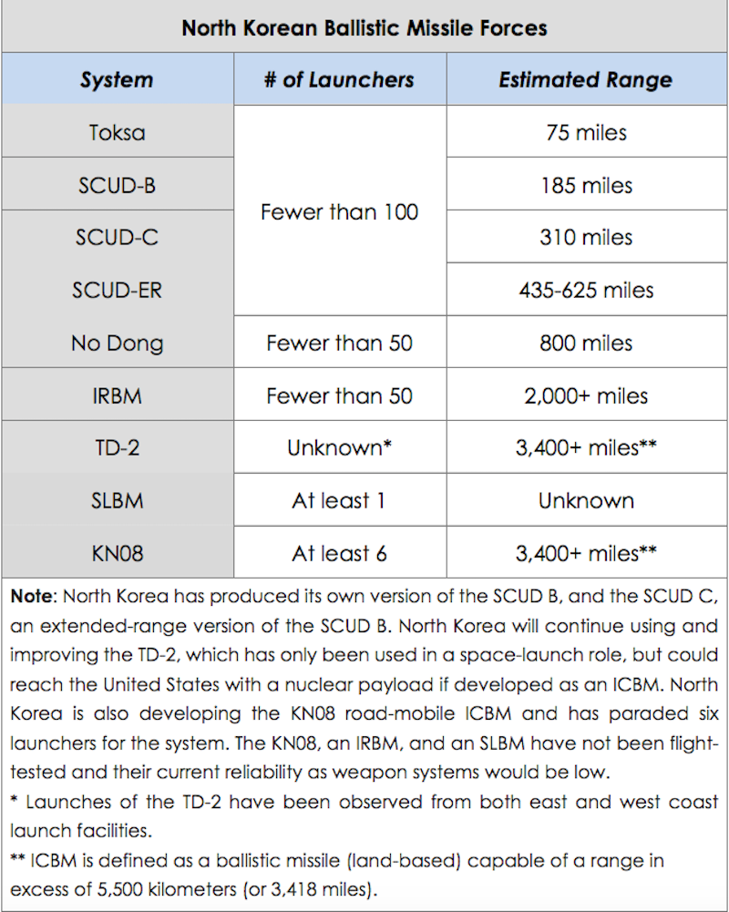 注:朝鲜已研发出国产版本的“飞毛腿”导弹SCUD B,以及射程更远的SCUD C。朝鲜将继续使用并改进TD-2,该系统此前仅用于航天发射,但如果将其升级为洲际导弹(ICBM),则可能负载核弹头打到美国。同时,朝鲜还在研发KN-08公路机动式洲际导弹,并在阅兵中展示了该系统的六个发射器。KN-08是一款远程弹道导弹(IRBM),而作为潜射弹道导弹(SLBM),其目前还没有进行过飞行测试,因此将其用作武器系统的可靠性还相对较低。(在这里,洲际导弹被定义为射程超过5500公里的(陆基)弹道导弹。)