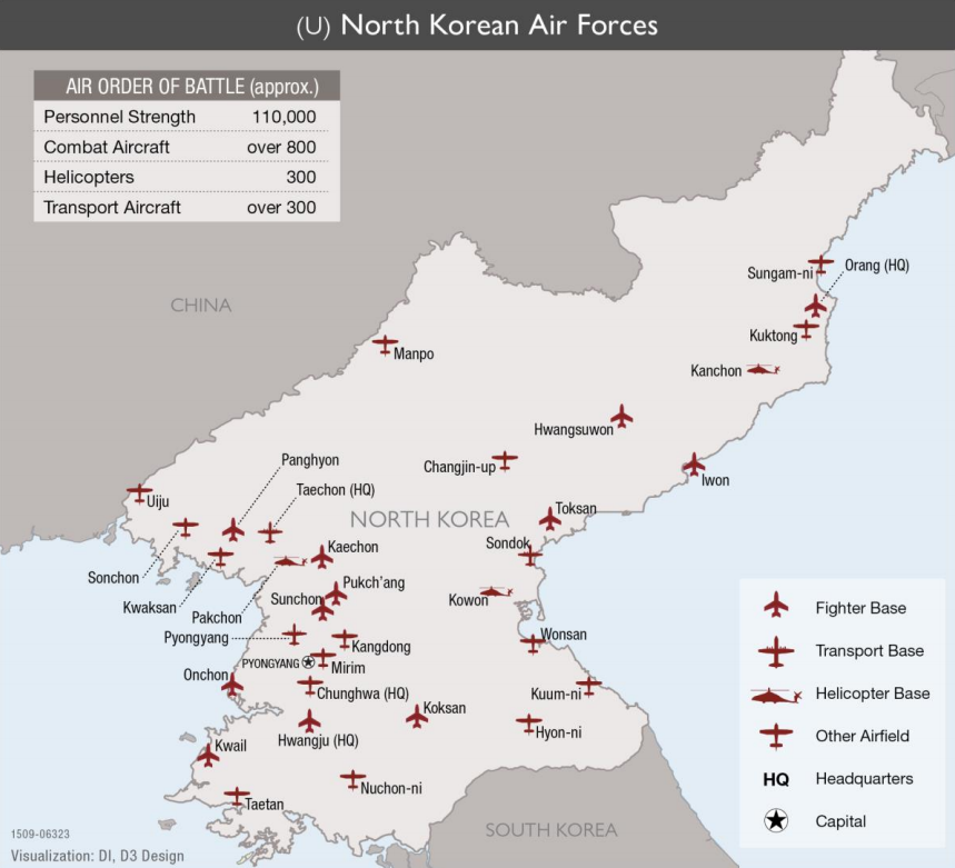 朝鲜第二大军事力量是其空军。和地面部队一样,这些战机基地也大多针对南部部署,有50%的空军部队位于距朝韩边境线100公里以内的区域。