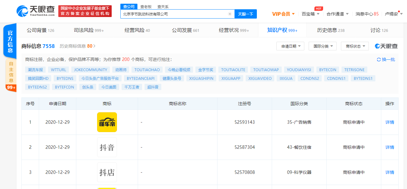 据天眼查APP显示,12月29日,北京字节跳动科技有限公司申请注册“抖店”商标,申请日期为12月29日,国际分类为科学仪器,商标状态为“商标申请中”。
