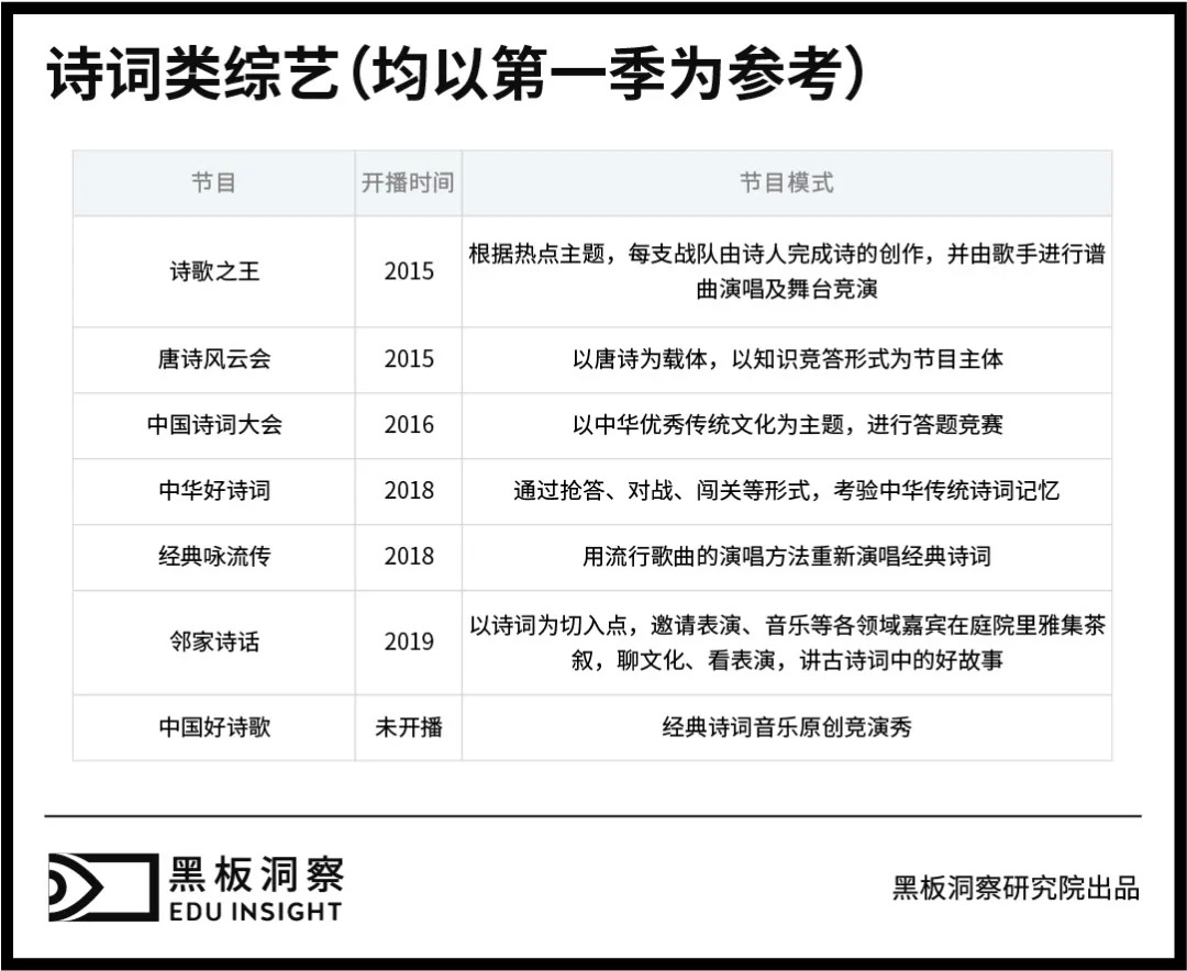 中华好诗词等三档节目在形式上仍侧重于考察记忆力的答题竞赛,未跳脱出知识记忆的层面,另有三档节目都为诗词音乐竞演,音乐性更强。从娱乐性的角度来看,显然有不少综艺比诗歌更契合大众口味,而在文化性上,诗歌综艺对诗歌文化所产生的渗透作用也有限。