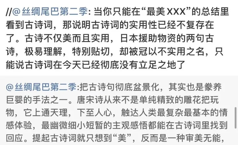微博博主丝绸的尾巴第二季认为,古诗词兼具美学价值与实用价值。具有代表性的唐宋诗,上通天理,下至人心,触达人类最基本最复杂的情感体验,最幽微细小短暂的主观感悟都能在古诗词里找到回应。学校教材所选取的诗歌偏好边塞诗、离别诗,多抒发诗人的爱国之情与壮志豪情,但是,中华几千年的诗歌浩如烟海,“绿蚁新醅酒,红泥小火炉“,、“醉后不知天在水,满船清梦压星河”这样的诗句描述的虽只是生活里细碎的场景,却拥有美的力量;疫情期间中日两国援助彼此时引用的“山川异域,风月同天”、“投我以木桃,报之以琼瑶”等诗句更是兼具思想性与实用性。AI写诗速度虽快,但其过于工整、匠气,永远不可能拥有人类的思考与感受力,用工具写诗的愉悦也不可能超越一个人表达内心所获得的愉悦。
