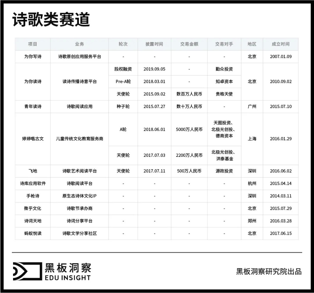 我们在企业查询网站共搜索到10个较为知名的诗歌平台,其中并没有像其他赛道一样的“教育培训机构”,多为诗歌阅读及分享平台,共四家获得融资,融资轮次多为早期融资,金额从数十万到几千万不等,其中融资金额达5000万的平台为儿童传统文化教育服务商。从地域上来看,则多集中于北上广深或杭州等经济发达城市。