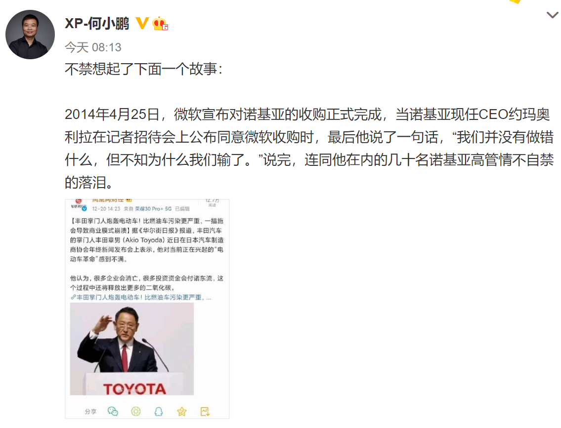 何小鹏在微博上指出,"不禁想起了下面一个故事——2014年4月25日,微软宣布对诺基亚的收购正式完成,当诺基亚现任CEO约玛奥利拉在记者招待会上公布同意微软收购时,最后他说了一句话,'我们并没有做错什么,但不知为什么我们输了。'说完,连同他在内的几十名诺基亚高管情不自禁的落泪。"该段文字下,何小鹏特意附上了丰田章男言论的报道配图。