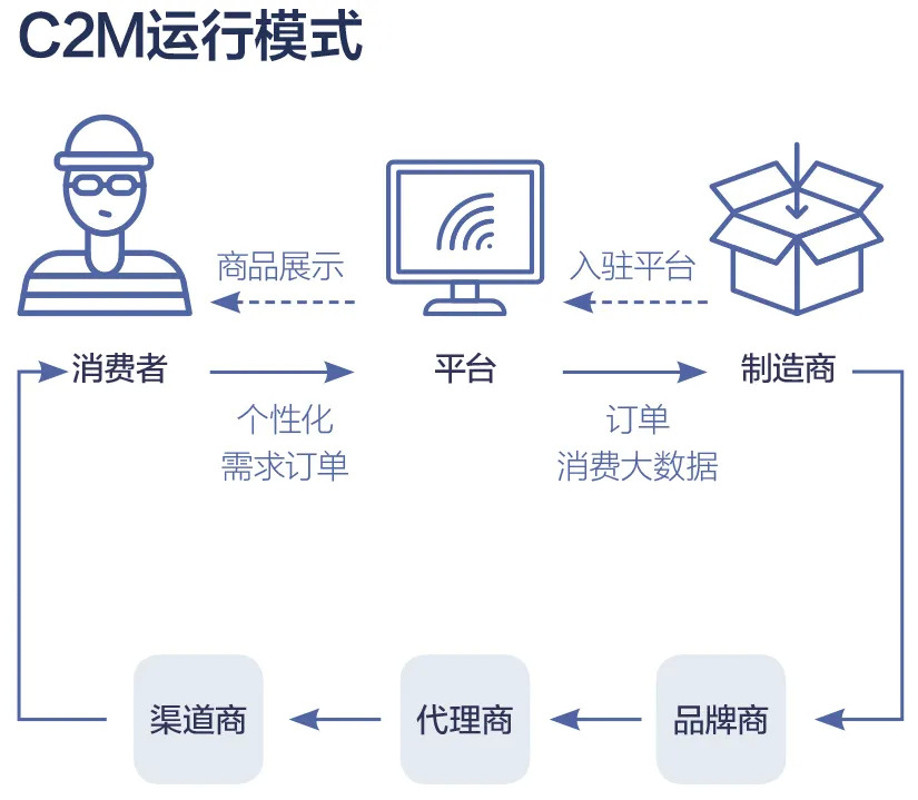 2018年12月,拼多多对C2M全面布局,启动“新品牌计划”,采用C2M模式与制造商共同打造爆款产品;2019年8月,京东通过旗下“京东京造”启动C2M个性定制服务,2020年11月25日,京东发布“C2M智能工厂”计划。