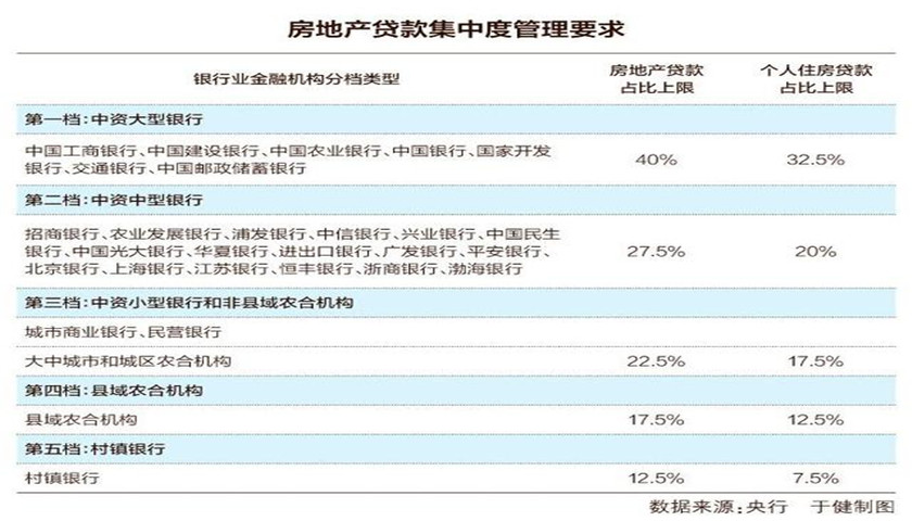 人民银行与银保监会根据不同银行的资产规模及机构类型,分成五档对房地产贷款集中度进行管理,这五档分别包括中资大型银行、中资中型银行、中资小型银行和非县域农合机构、县域农合机构、村镇银行。其中,第一档中资大型银行房地产贷款占比上限为40%。