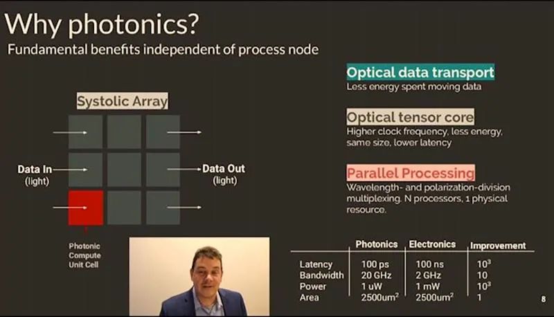 ▲Lightmatter联合创始人兼CEO尼克·哈里斯在2020年Hot Chips上讲解光子计算相较电子计算的延时、带宽、功耗优势