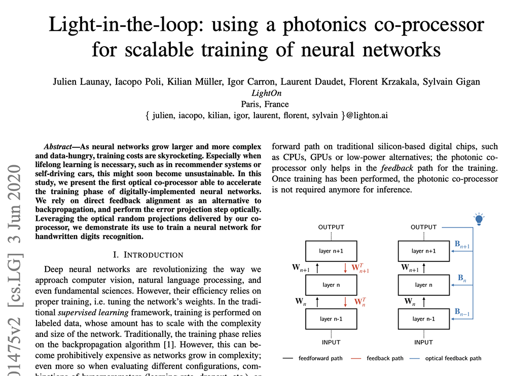 2018年,成立两年、总部位于法国巴黎的创企LightOn宣布,它已经开始在欧洲的数据中心测试自己的光学处理单元(OPU)技术。2020年6月,LightOn发表的新论文显示,其光学神经网络训练芯片在运行基于MNIST手写数字数据集训练的模型时,学习率为0.01,测试准确率达到95.8%;同一算法在GPU上的学习率为0.001、准确率达97.6%。而该光学芯片的功耗效率要比GPU高出一个数量级。