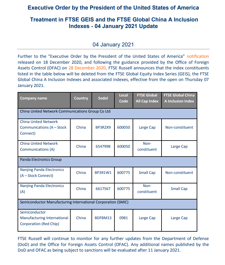 声明中,富时罗素表示公司已参照特朗普政府禁止投资被指“有军方背景中资企业”的行政令,经审核后把一些中资企业移出全球指数。