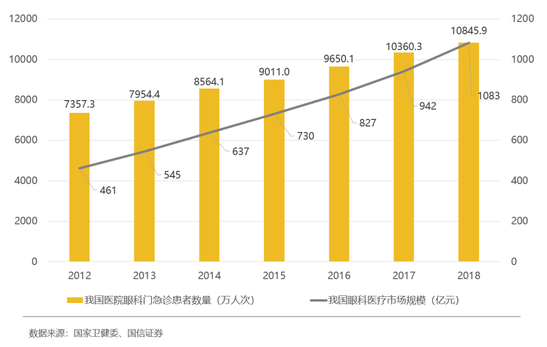 根据国家卫健委的统计,我国医院眼科门急诊患者数量从2012年的7357.3万人次上升至2018年的1.08亿人次。国信证券的数据显示,同期我国眼科医疗市场份额从461亿元增长至1083亿元,年复合增长率超过15%[16]。