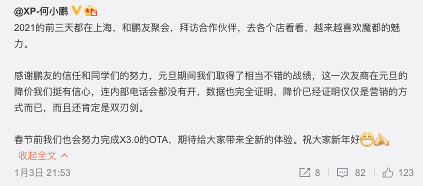同样,何小鹏也在其个人社交账号发文表示,“这一次友商在元旦的降价我们挺有信心,连内部电话会都没有开,数据也完全证明,降价已经证明仅仅是营销的方式而已,而且还肯定是双刃剑。”