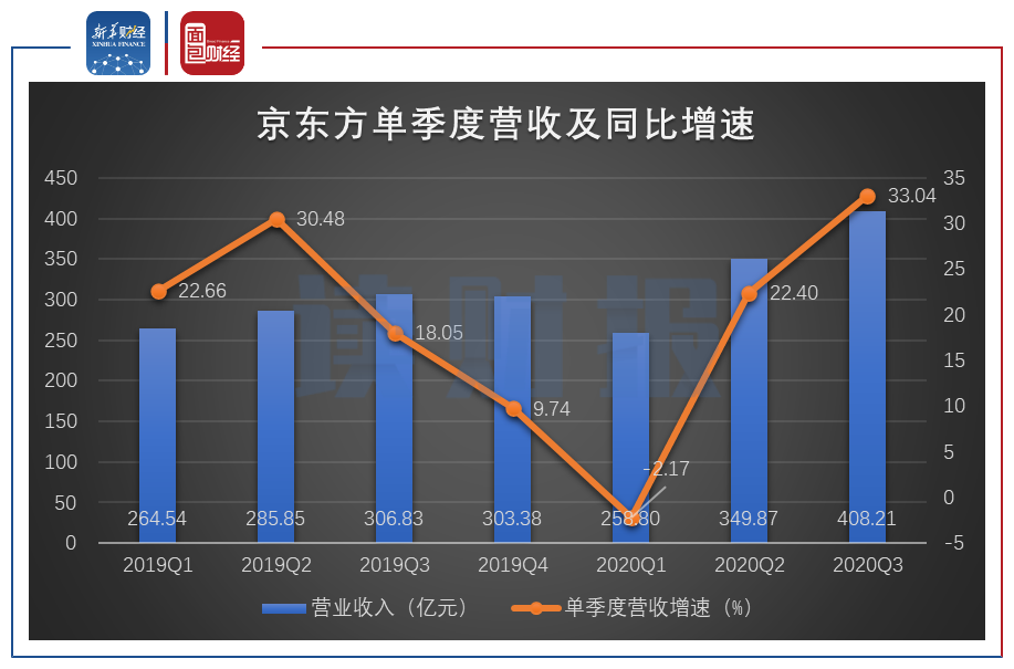 图2:2019年一季度至2020年三季度京东方单季度营收及同比增速
