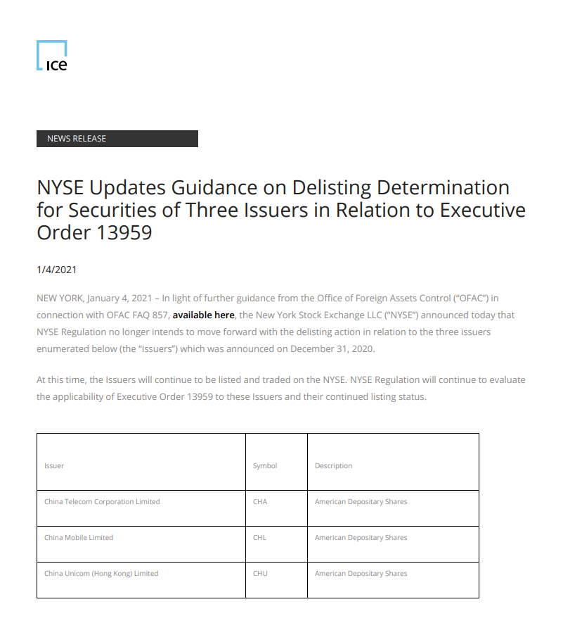 美东时间2020年12月31日,纽交所宣布启动对中国移动、中国电信和中国联通三家电信运营商的摘牌程序。中国证监会4日就此事回应称,美方出于政治目的实施行政命令,完全无视相关公司实际情况和全球投资者的合法权益,严重破坏了正常的市场规则和秩序。