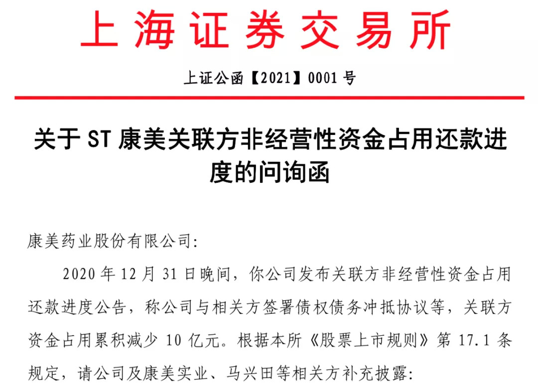首先是,上证公函【2021】0001号问询函,是针对ST康美(600518. SH)关联方非经营性资金占用还款进度的相关问询。