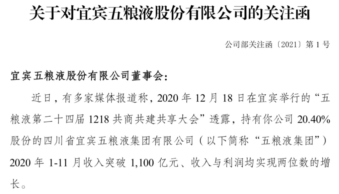 关注函称,有多家媒体报道2020年12月18日在宜宾举行的“五粮液第二十四届1218共商共建共享大会”透露,四川省宜宾五粮液集团有限公司(以下简称“五粮液集团”)2020年1-11月收入突破1100 亿元、收入与利润均实现两位数的增长。