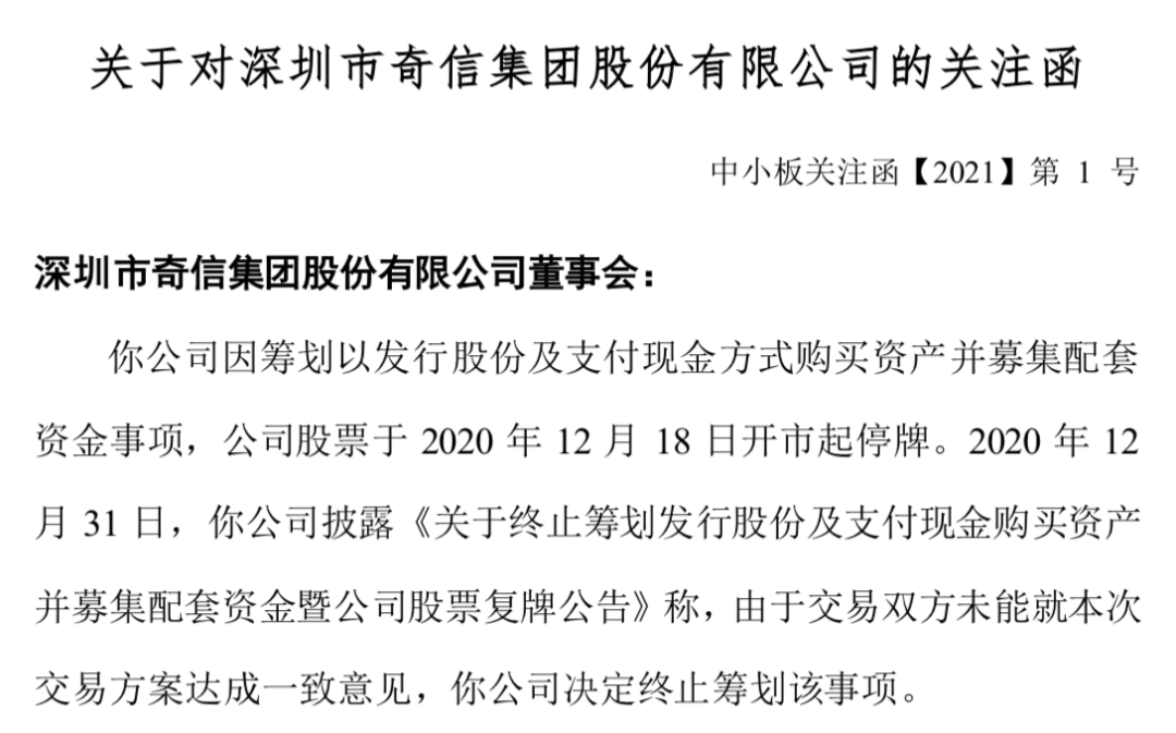 最后是深交所中小板关注函【2021】第1号,奇信股份(002781. SZ)。