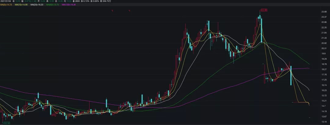 截至2021年1月4日,ST康美报收2.63元/股,其2018年股价高点为27.99元/股。