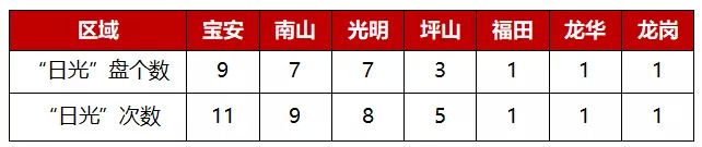 以上28个日光盘,从分布的区域来看,宝安以9个日光盘、日光11次之多,位居各区之首。