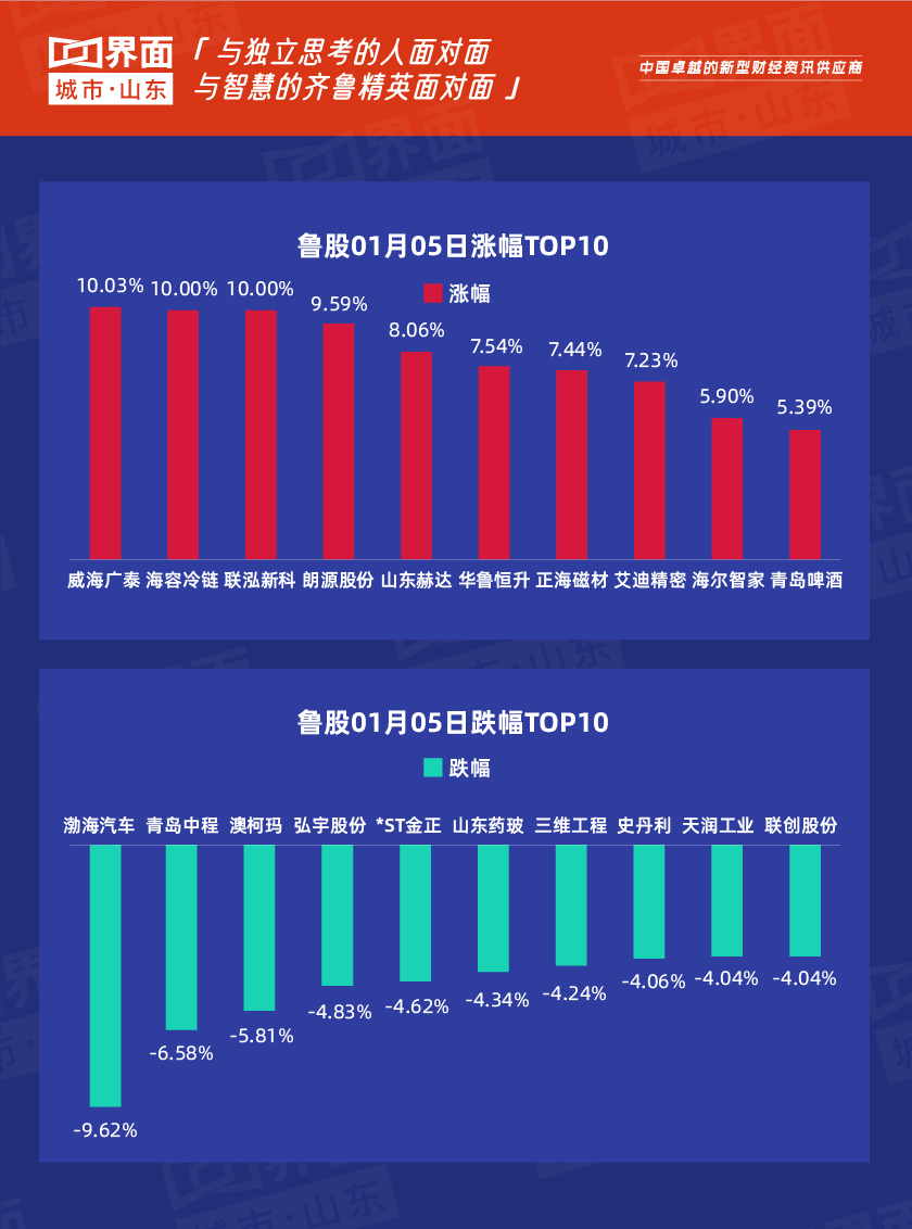 01月05日,山东省内沪深股票97只个股上涨,127只股下跌,3股持平。