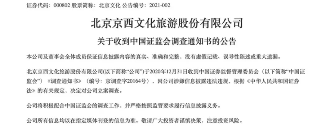 如今,事件有了新进展。1月3日晚间,北京文化公告称,2020年的最后一天,收到中国证监会的《调查通知书》,因涉嫌信息披露违法违规,证监会决定对其立案调查。消息公布后,2021年A股首个交易日,北京文化开盘一字跌停,股价报5.28元。