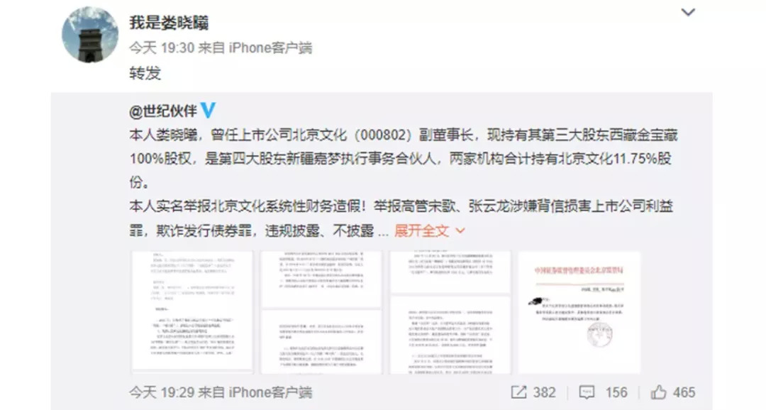 随后,北京文化原副董事长娄晓曦在微博实名举报,北京文化董事长宋歌和董事张云龙,涉嫌背信损害上市公司利益。