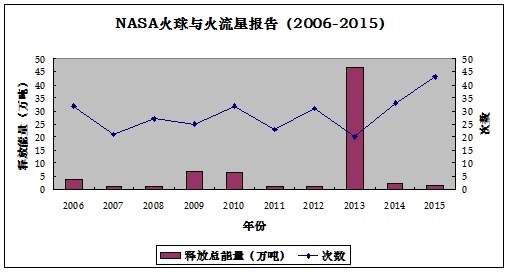 根据NASA的《火球与火流星报告》(Fireball and Bolide Reports),NASA在2006年到2015年这十年间共记录到287次“火流星”事件,其中释放能量超过1万吨TNT当量的有八次。平均下来,该类事件每年释放出的能量在7万吨TNT左右。