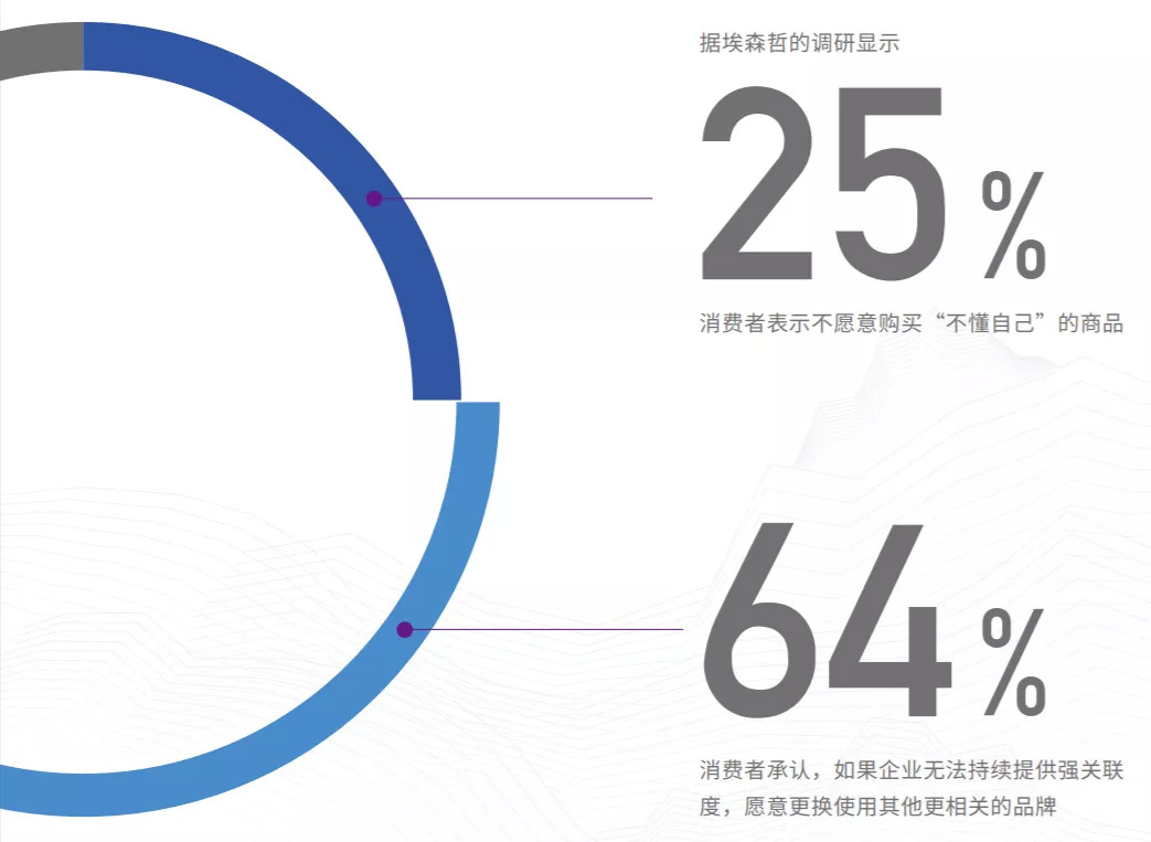 根据埃森哲调研,25%的消费者表示不愿意购买“不懂自己”的商品;64%的消费者表示,如果企业无法持续提供强关联度,他们将更换使用其他更相关的品牌。