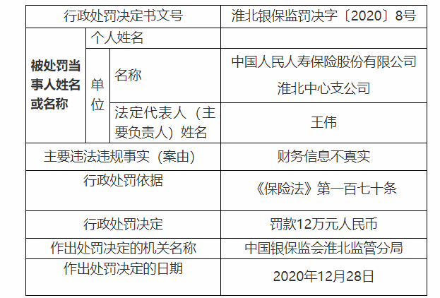 银保监会1月5日消息,据淮北银保监分局行政处罚信息公开表(淮北银保监罚决字〔2020〕8号),中国人民人寿保险股份有限公司淮北中心支公司因财务信息不真实被罚12万元人民币。