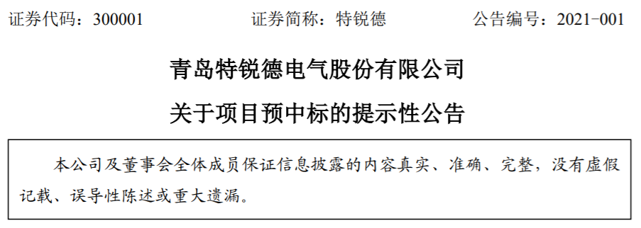 1月4日晚间,特锐德发布公告称,近日,公司收到预中标海上风电项目与南网项目的通知。此次海上风电项目预中标金额10576万元,南网项目预中标金额则为3273.60万元。