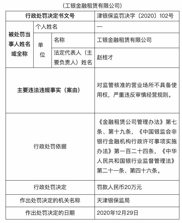 1月6日,中国银行保险监督管理委员会天津监管局公布的行政处罚信息公开表显示,工银金融租赁有限公司因对监管核准的营业场所不具备使用权,严重违反审慎经营规则,被处罚款人民币20万元。