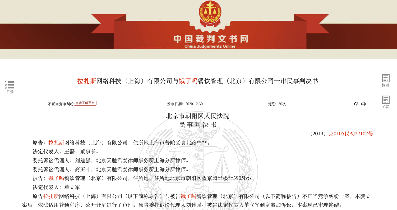 1月6日消息,中国裁判文书网于2020年12月30日发布拉扎斯网络科技(上海)有限公司与饿了吗餐饮管理(北京)有限公司一审民事判决书。北京市朝阳区人民法院作出判决:被告饿了吗餐饮管理(北京)有限公司于本判决生效之日立即变更其企业名称,变更后的企业名称中不得含有与“饿了么”相同或者近似的文字;被告饿了吗餐饮管理(北京)有限公司赔偿原告拉扎斯网络科技(上海)有限公司合理费用10000元。