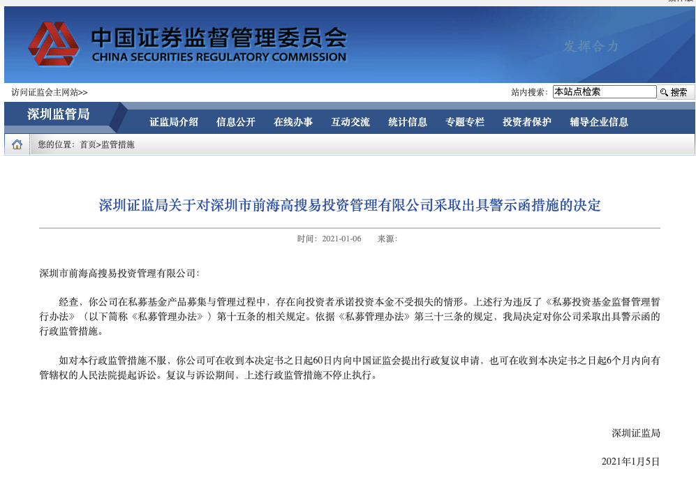 1月6日,深圳证监局发布关于对深圳市前海高搜易投资管理有限公司采取出具警示函措施的决定。经查,深圳市前海高搜易投资管理有限公司在私募基金产品募集与管理过程中,存在向投资者承诺投资本金不受损失的情形。上述行为违反了相关规定。依据规定,深圳证监局决定对深圳市前海高搜易投资管理有限公司采取出具警示函的行政监管措施。