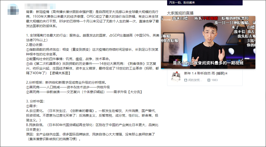 还有@所长林超,凭借一篇《疫情后的新世界,我们需要了解的五大趋势》获全站第5名的好成绩,帮助他突破了一个阶段的发展瓶颈。他的内容可以说是整篇干货内容的“堆砌”,满满知识点,视频评论的前三排全是课代表整理的内容重点,受欢迎度可见一斑。
