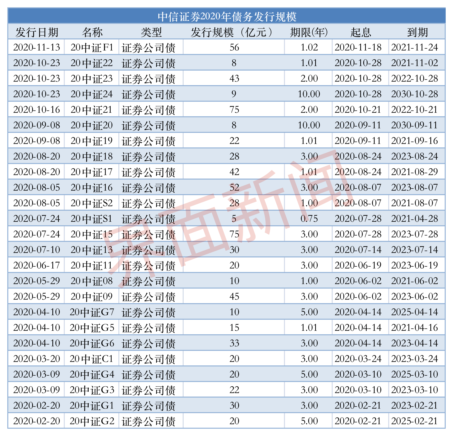 本次800亿的发行规模略高于中信证券2020年全年公司债发行规模。同花顺iFind数据显示,2020年中信证券累计发行726亿元的证券公司债,其中186亿元将在2021年内到期。