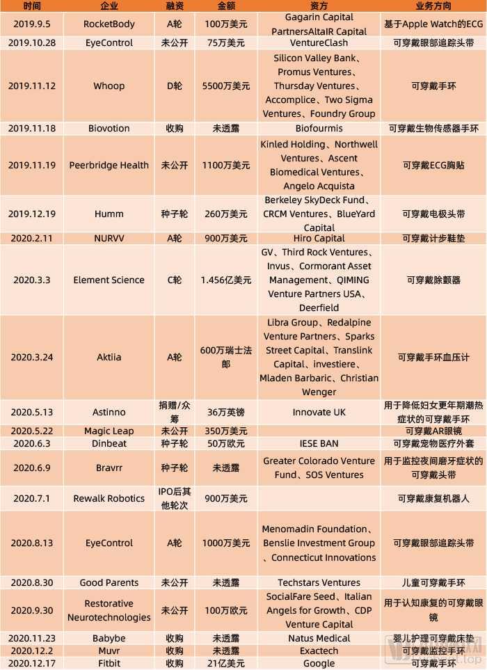 自2020年8月以来,可穿戴设备领域发生了20起收购及融资事件,经换算后金额接近24亿美元。其中,谷歌对Fitbit的收购金额高达21亿美元,是近年来这一领域涉及金额最大的融资及并购事件。