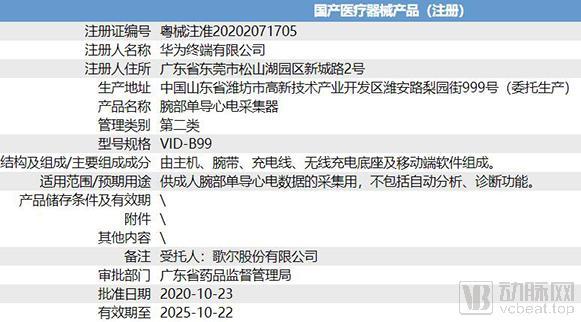 华为Watch GT2 Pro ECG医疗器械注册证信息(截图来自NMPA官网)
