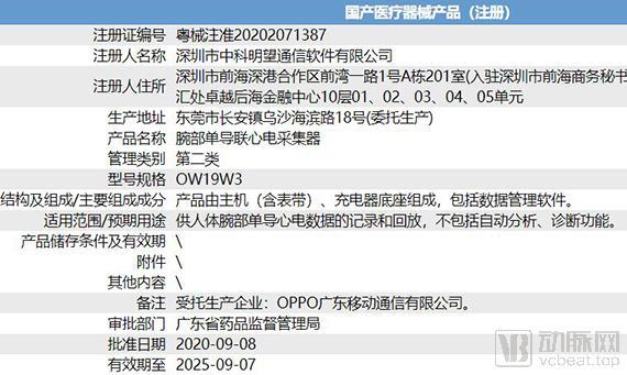 仅仅两天后的9月24日,OPPO宣布OPPO Watch ECG全球首发,并宣布这款具备ECG持续监控功能的智能手表获得了NMPA医疗器械二类证。在NMPA网站中,这款产品以其集团旗下企业深圳市中科明望通信软件有限公司的名义注册。