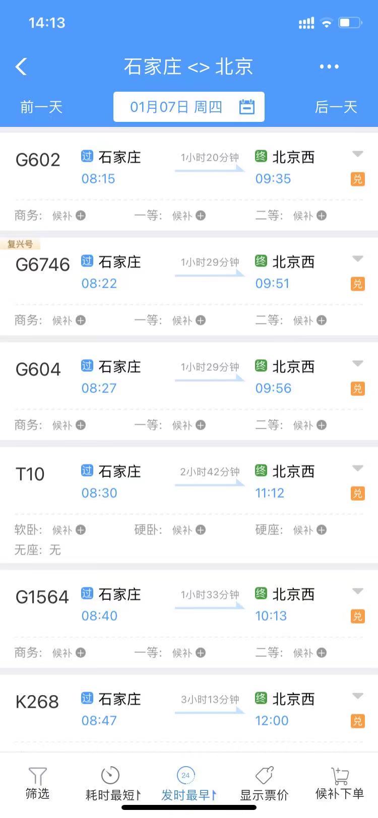 受河北疫情影响,12306现已无法购买石家庄、邯郸、邢台等地至北京的火车票。