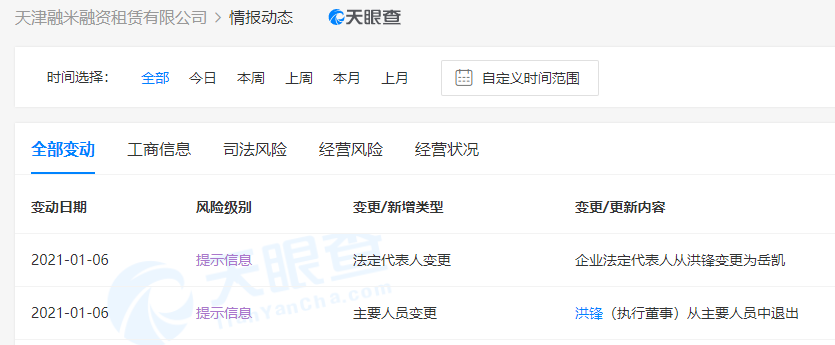 据天眼查APP显示,近日,天津融米融资租赁有限公司发生工商变更,小米集团联合创始人洪锋退出法定代表人、执行董事,均由岳凯接任。